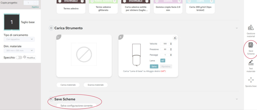Una volta arrivati nell’ultima pagina, selezionare il materiale desiderato e controllare che le impostazioni di taglio siano corrette.