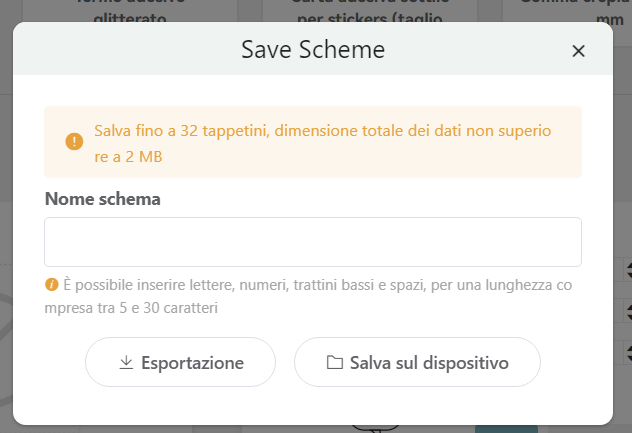 A questo punto verrà chiesto di dare un nome allo schema salvato e si potrà scegliere tra “Esportazione” e “Salva sul dispositivo“.